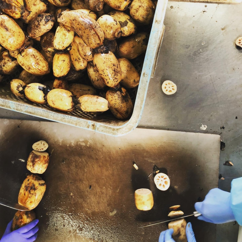 蓮根を仕入れ、味噌をつめ、揚げて、といった工程で製造。従業員さんはその全ての工程に携わっていらっしゃいます。